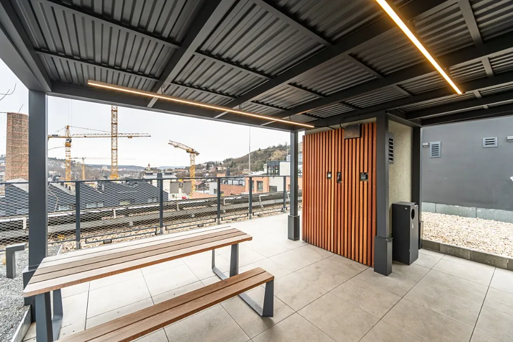 Rezidenti mohou využívat recepci a střešní terasu s posezením pro relaxaci.