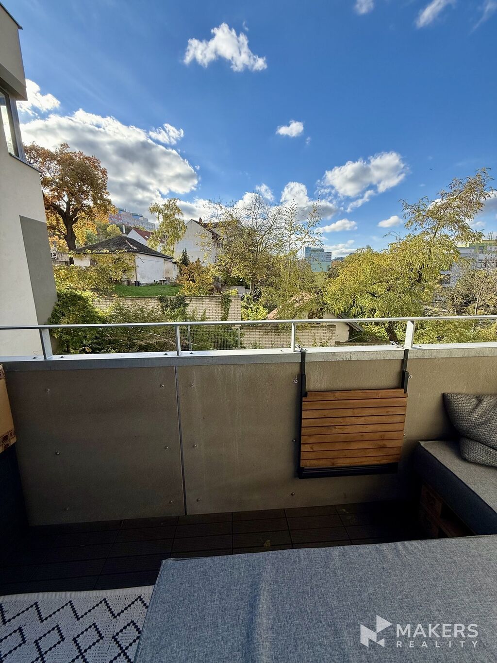 Obývací pokoj i ložnice jsou vkusně zařízené a laděné do nadčasových tónů. Vstup na prostornou zasklenou lodžii je možný z obývací části – ideální pro ranní kávu i relax večer.