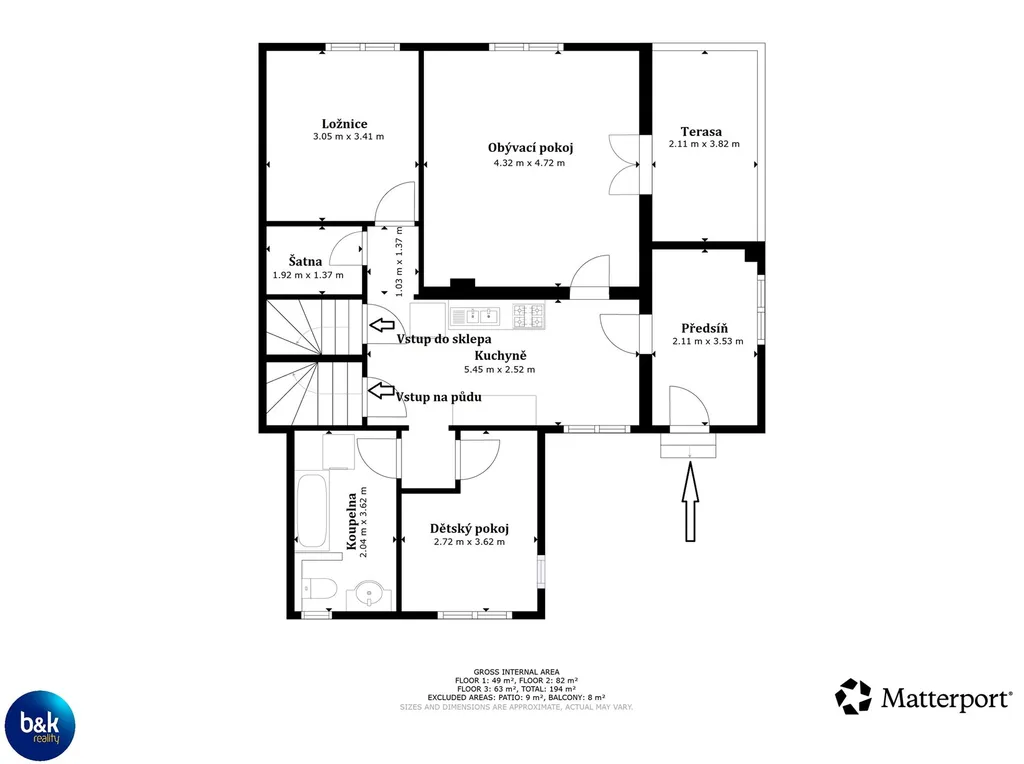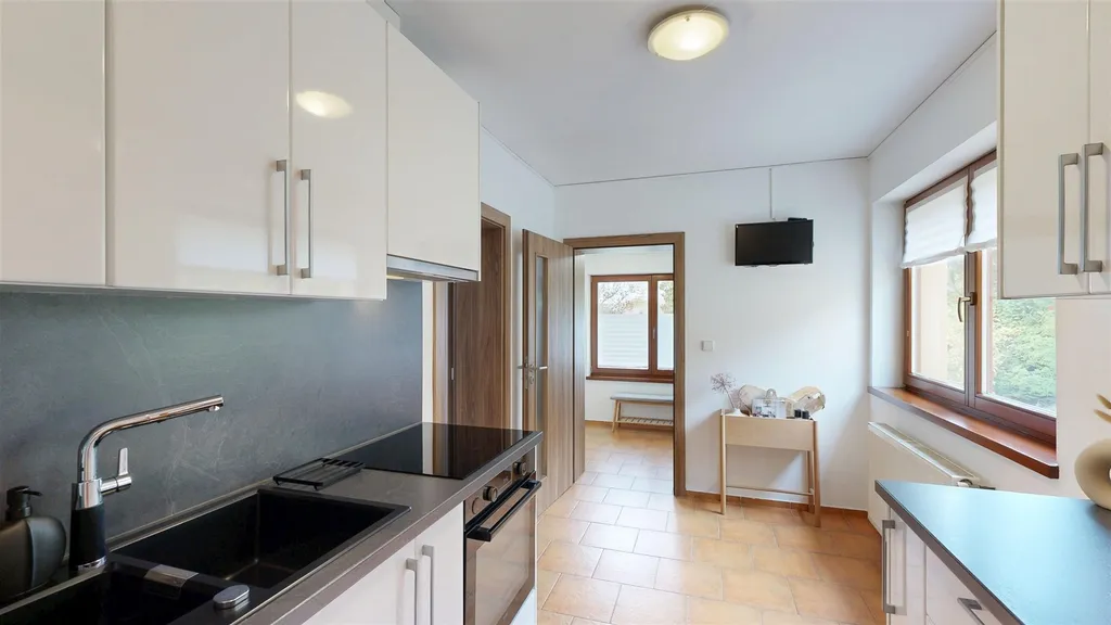 Z přízemí vede schodiště do suterénu (sklepa) a na půdu, která je připravena k půdní vestavbě – vhodné pro rozšíření obytného prostoru nebo vybudování samostatné jednotky.