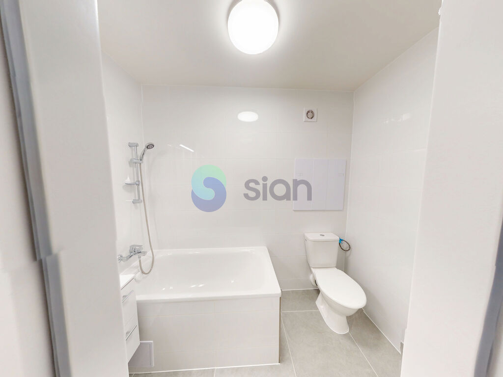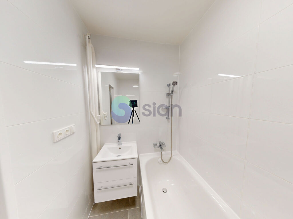 V koupelně se nachází vana, umyvadlo s úložnou skříňkou a toaleta.