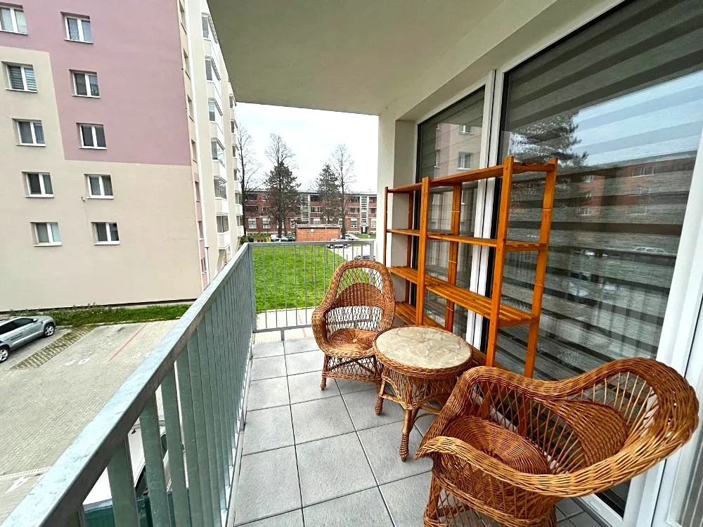 Je zde výstup na velmi příjemnou a prostornou lodžii se zahradním nábytkem.
