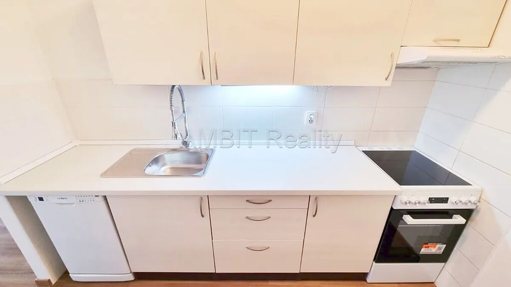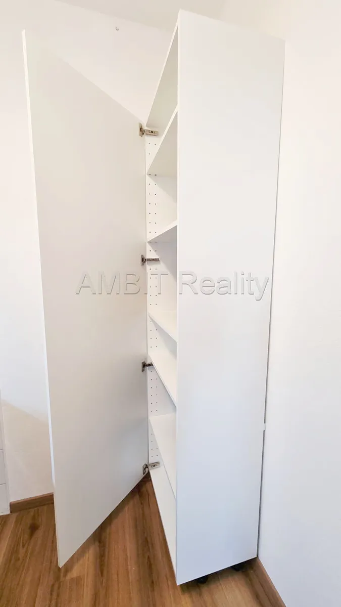 Byt sestává z obývacího pokoje, samostatného kuchyňského koutu, ložnice, koupelny, samostatného WC a předsíně. Byt se pronajímá nezařízený – viz foto a videoprohlídka v tomto inzerátu (detaily se mohou lišit). Kuchyňský kout je vybavený kuchyňskou linkou se spotřebiči elektrický sporák se sklokeramickou varnou deskou a elektrickou pečicí troubou, digestoří, myčkou nádobí a lednicí s mrazákem. V koupelně se nachází umyvadlo, pračka s horním plněním a velmi prostorný sprchový kout. WC je samostatně. V předsíni jsou k dispozici úložné skříňky a police a velká policová skříň. V ložnici je knihovna, zásuvková komoda a šatní skříň.