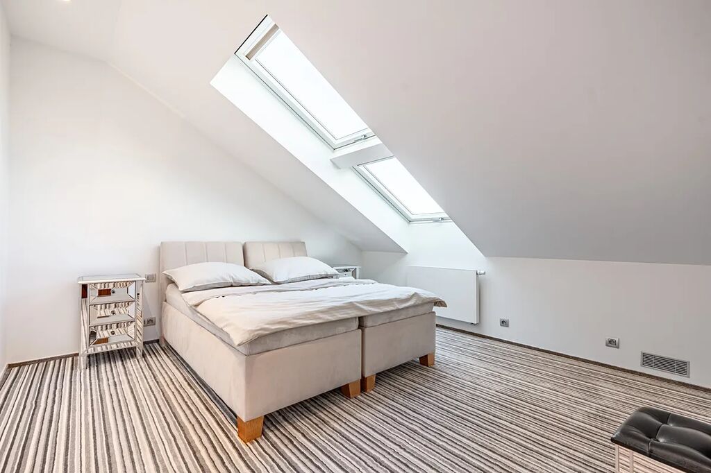 Byt nabízí dvě samostatné ložnice – jedna z nich má vestavěnou šatnu, obě jsou vybavené velkoformátovými střešními okny, která zajišťují dostatek světla a působí mimořádně vzdušně.