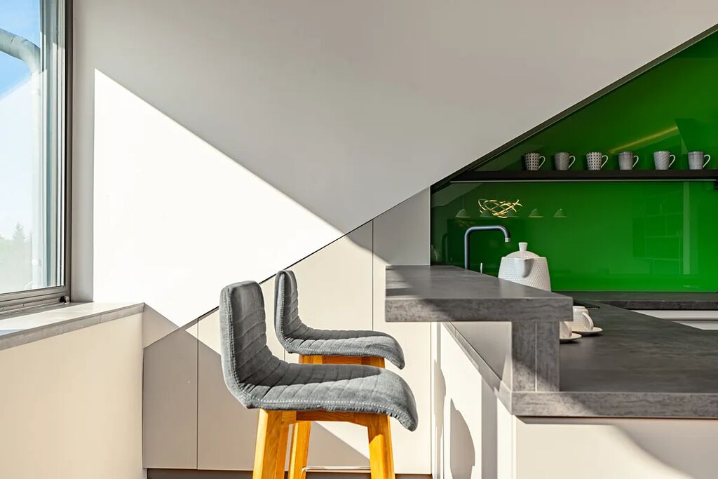 Dominantou bytu je vzdušná kuchyně s ostrůvkem, která plynule přechází do prostorného obývacího pokoje, z oken obývací části se otevírá jedinečný panoramatický výhled na město Příbor a hřebeny Beskyd, který dává bytu výjimečnou atmosféru.