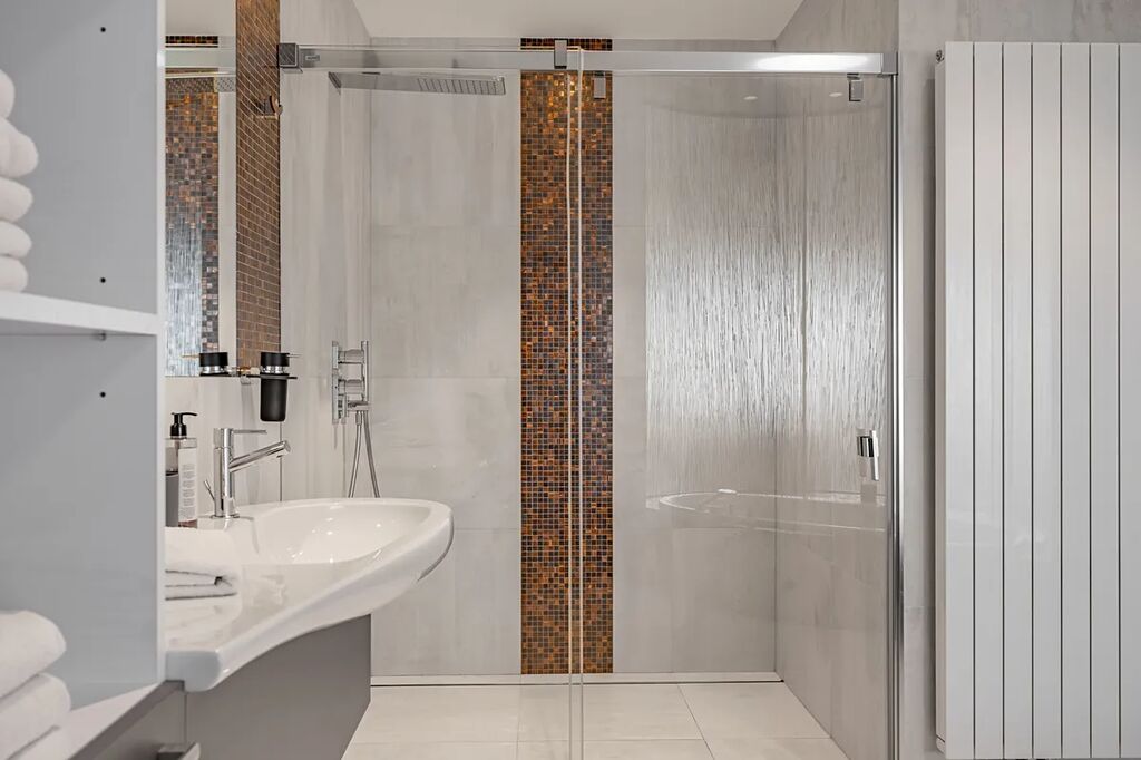 V unikátní koupelně najdete designovou vanu, toaletu i velkorysý sprchový kout – vše ve špičkovém provedení a s důrazem na detail.