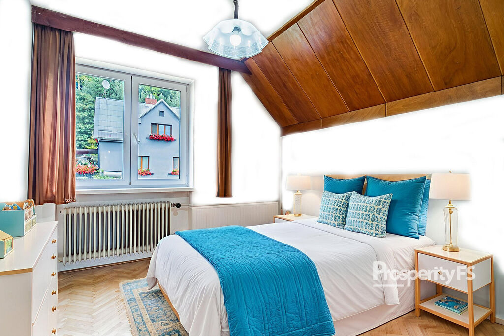 V přízemí vás přivítá prostorná vstupní hala, velký obývací pokoj s přípravou na krb, samostatná kuchyně, dvě ložnice, koupelna a samostatná toaleta. Z obývacího pokoje můžete vyjít přímo na terasu s nádherným výhledem na Lysou horu – ideální místo pro ranní kávu nebo večerní posezení.