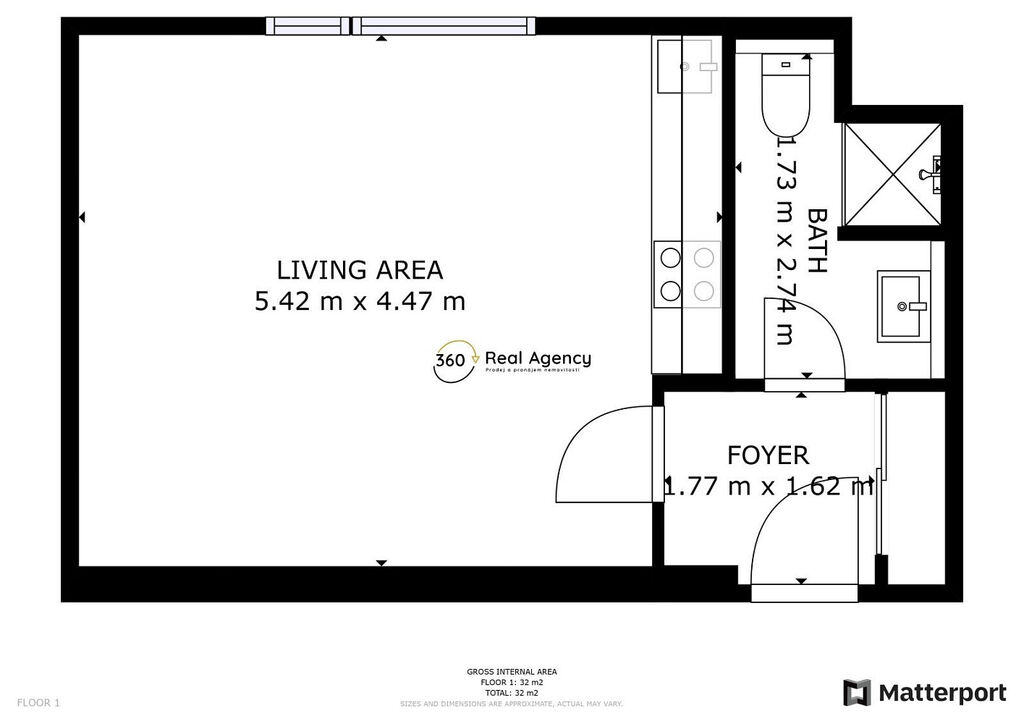 Dispozice je navržena prakticky a s důrazem na pohodlí – vstupní chodba s velkou vestavěnou skříní, koupelna se sprchovým koutem a toaletou a světlý obývací pokoj s kuchyňským koutem a výhledem do okolní přírody. Velkoformátové okno dodává prostoru vzdušnost a světlo.