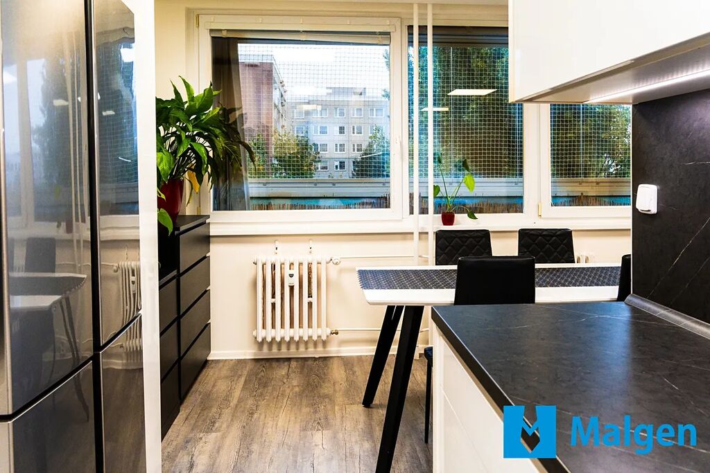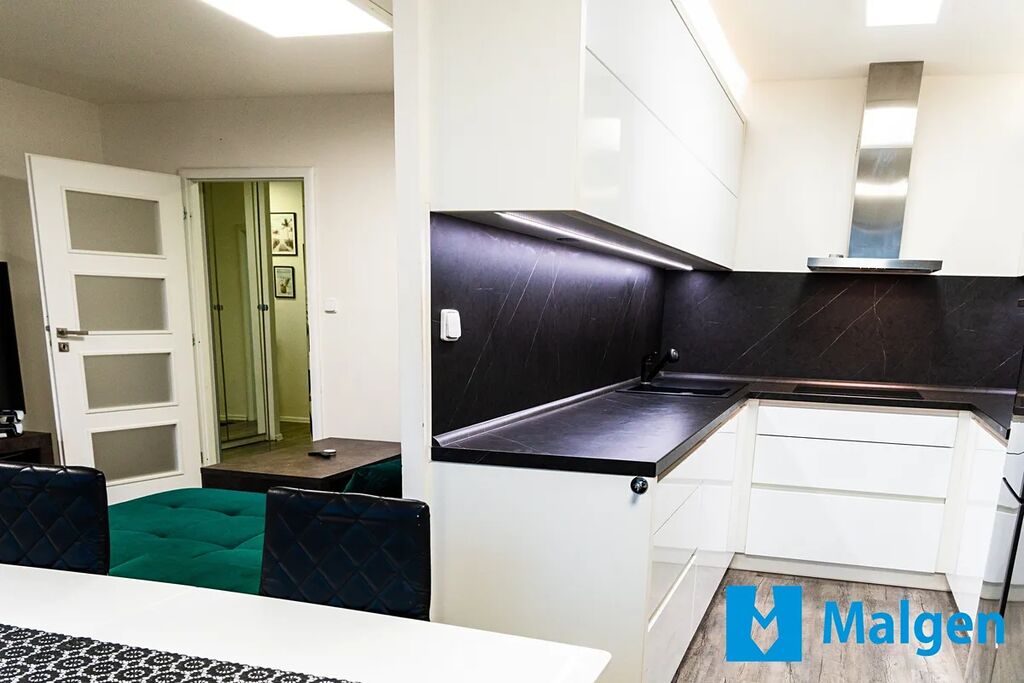 Dispozice bytu zahrnuje prostorný obývací pokoj propojený s moderním kuchyňským koutem včetně spotřebičů, ložnici, další pokoj (aktuálně využívaný jako pracovna), koupelnu s vanou a samostatnou toaletu. Součástí je také zasklená lodžie (7 m²) s klidným výhledem do vnitrobloku se zelení a dětským hřištěm. V bytě je dostatek úložných prostor, včetně vestavěných skříní, a komfort zvyšuje i elektrické podlahové vytápění v koupelně a na toaletě. Dle dohody je možné ponechat i zánovní vybavení a nábytek.