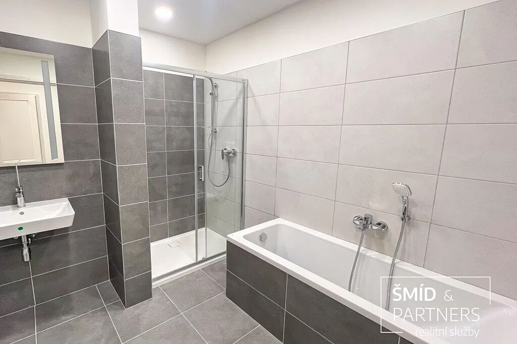 V prostorné koupelně se nachází sprchový kout a vana. WC je samostatné.