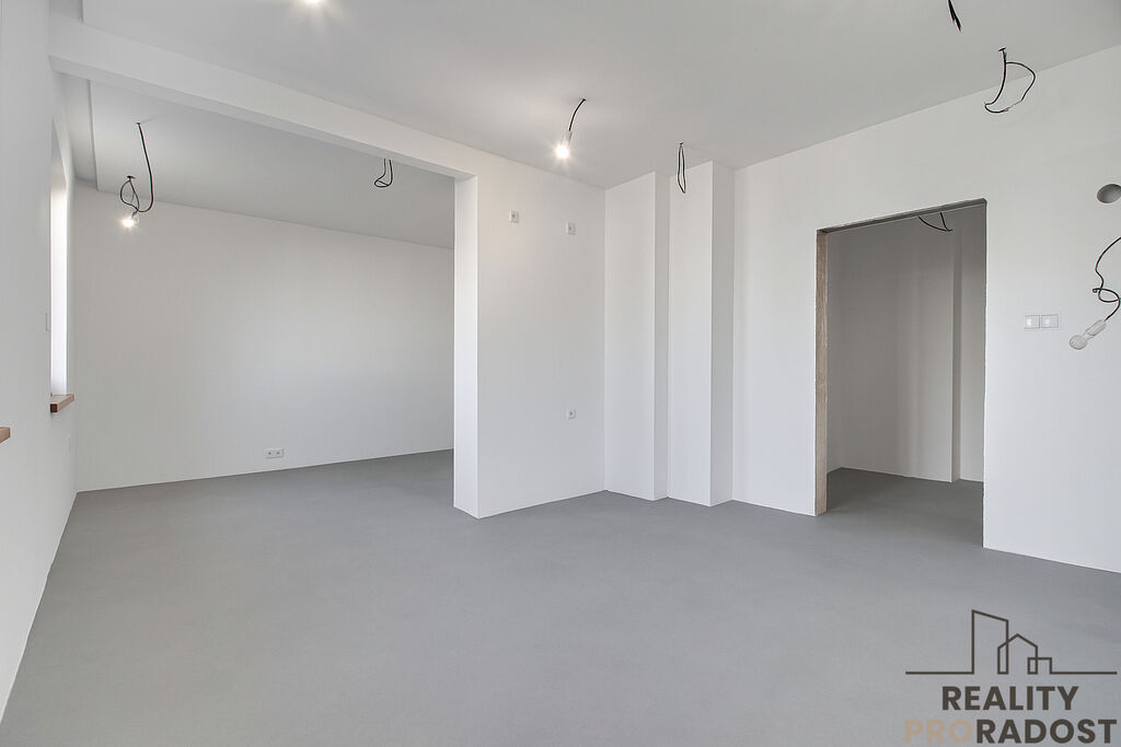 Osvětlení v LED technologii, nové měděné elektroinstalace, příprava pro kuchyňské spotřebiče i digestoř, betonový podklad pro podlahu – vše čeká na finální designový dotek nového majitele.