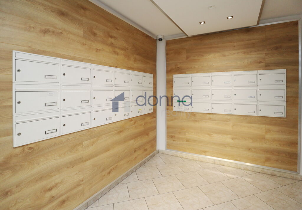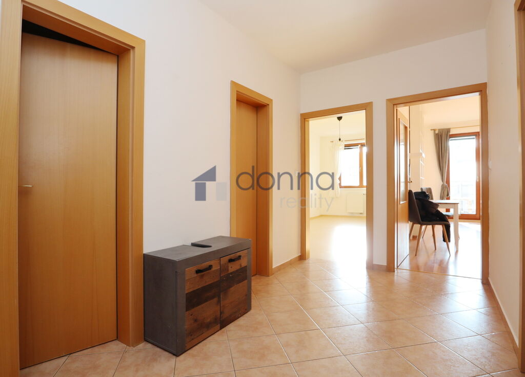 Dispozice: obývací pokoj s kuchyňským koutem, ložnice, koupelna, samostatné WC, šatna, komora, předsíň a balkon. K bytu náleží vnitřní garážové stání umístěné ve společných garážích domu v podzemním podlaží, které je součástí nájmu. Kuchyně je plně vybavena - trouba, varná deska, mikrovlnná trouba, myčka, lednice. V koupelně je vana se sprchovou zástěnou. Šatna a komora je vybavena úložnými regály.