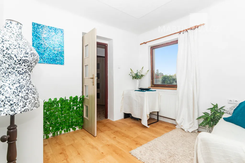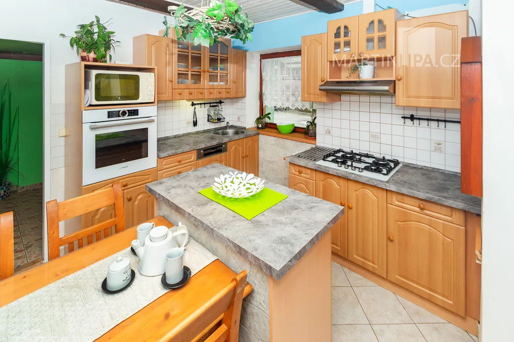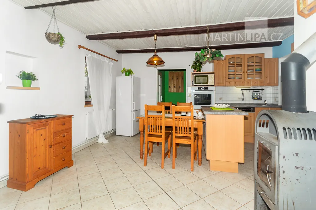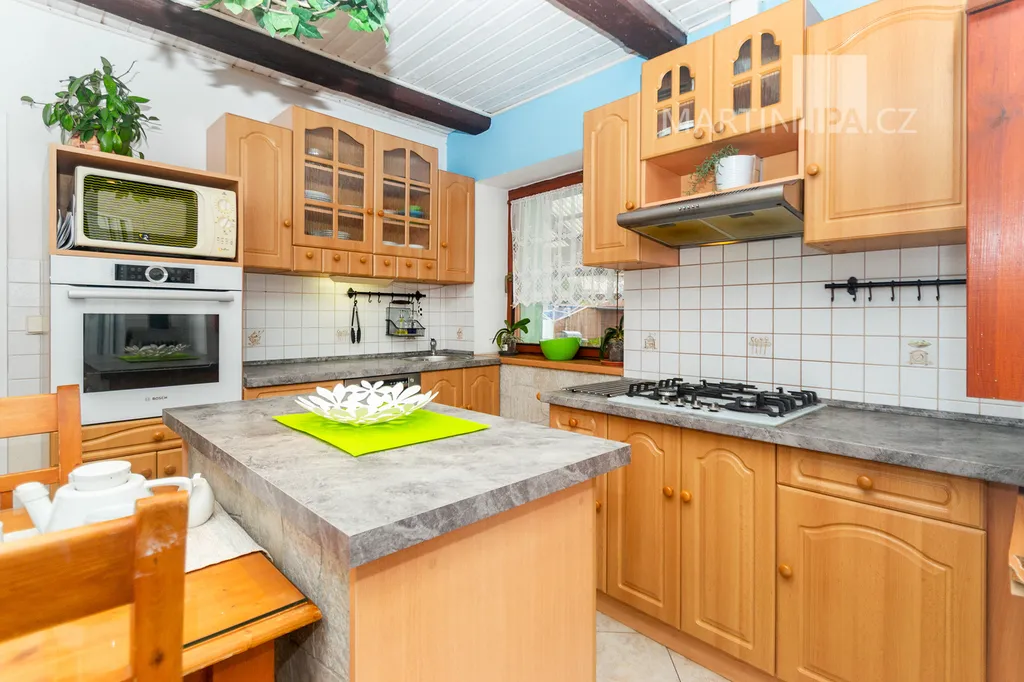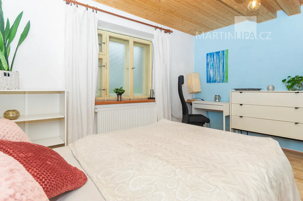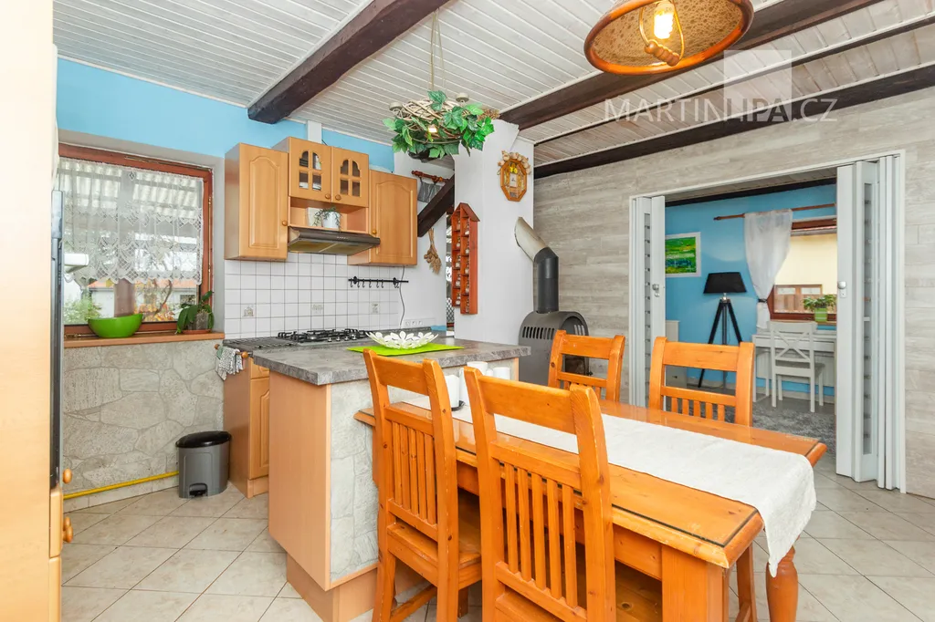 Dům je starší poctivý kus. Plně obyvatelný, místy s trochu unaveným make-upem, ale přitom upřímně připravený na další kapitolu. Rozhodně by vás neměl nijak překvapovat – a když, tak spíš pozitivně. V roce 2016 dostal novou střechu včetně krovu s krytinou Bramac, topí plynovým kotlem Vaillant (2002) a část oken se měnila v roce 2003. Dispozice 4+1 dává smysl v běžném provozu a pokud by vám to bylo málo, je zde velkrysá půda, přímo stvořená pro vestavbu dalších pokojů. Minimálně dva nebo tři by se tam v pohodě vešly. Střešní okna jsou již nainstalována a na vás by zůstalo jen to vymyslet a dotvořit.