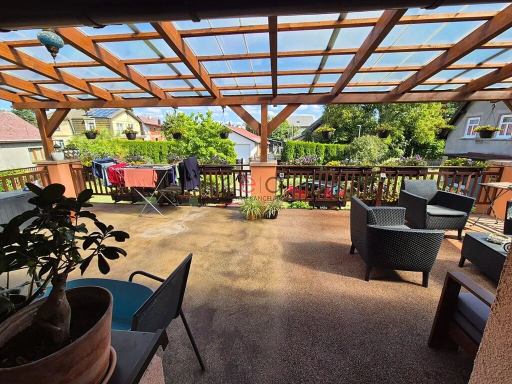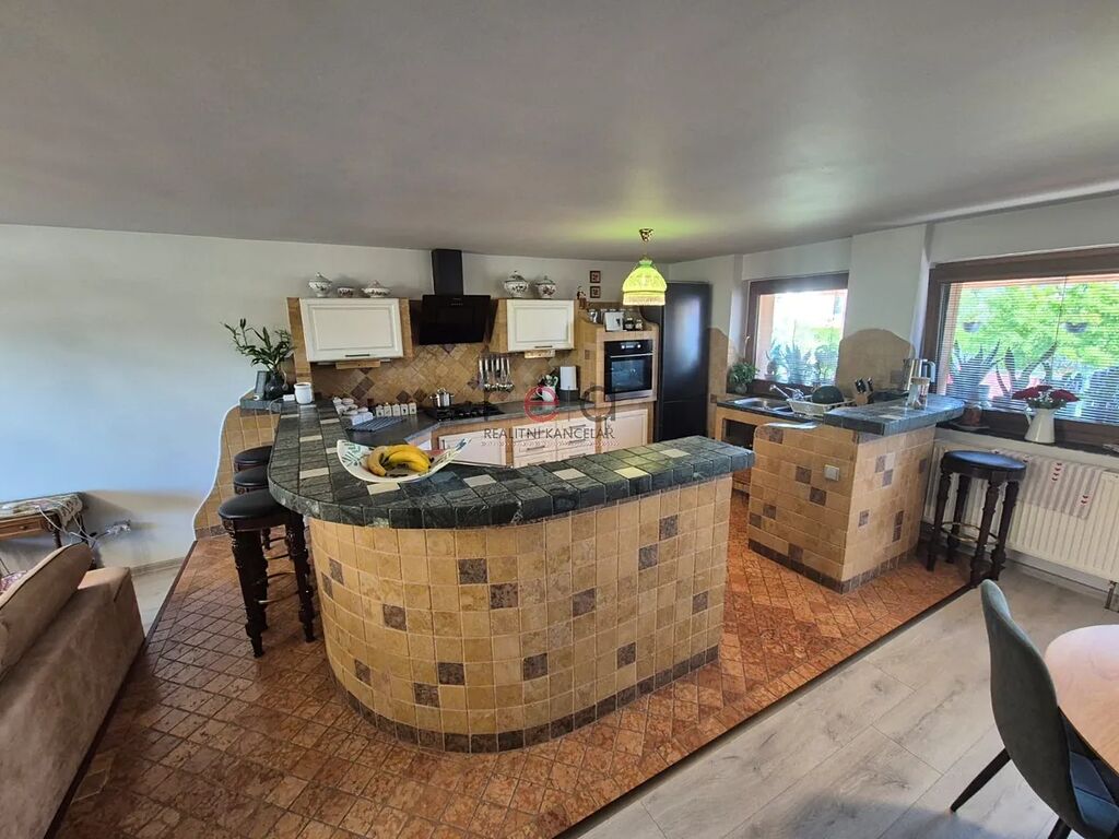 V patře je velký obývací prostor s jídelnou a kuchyní s vestavnými spotřebiči (70m2), veliká zastřešená terasa situovaná na JV, ložnice, koupelna rohovou vanou, WC, schodiště do podkroví.