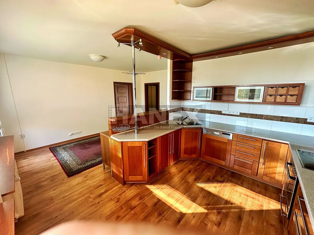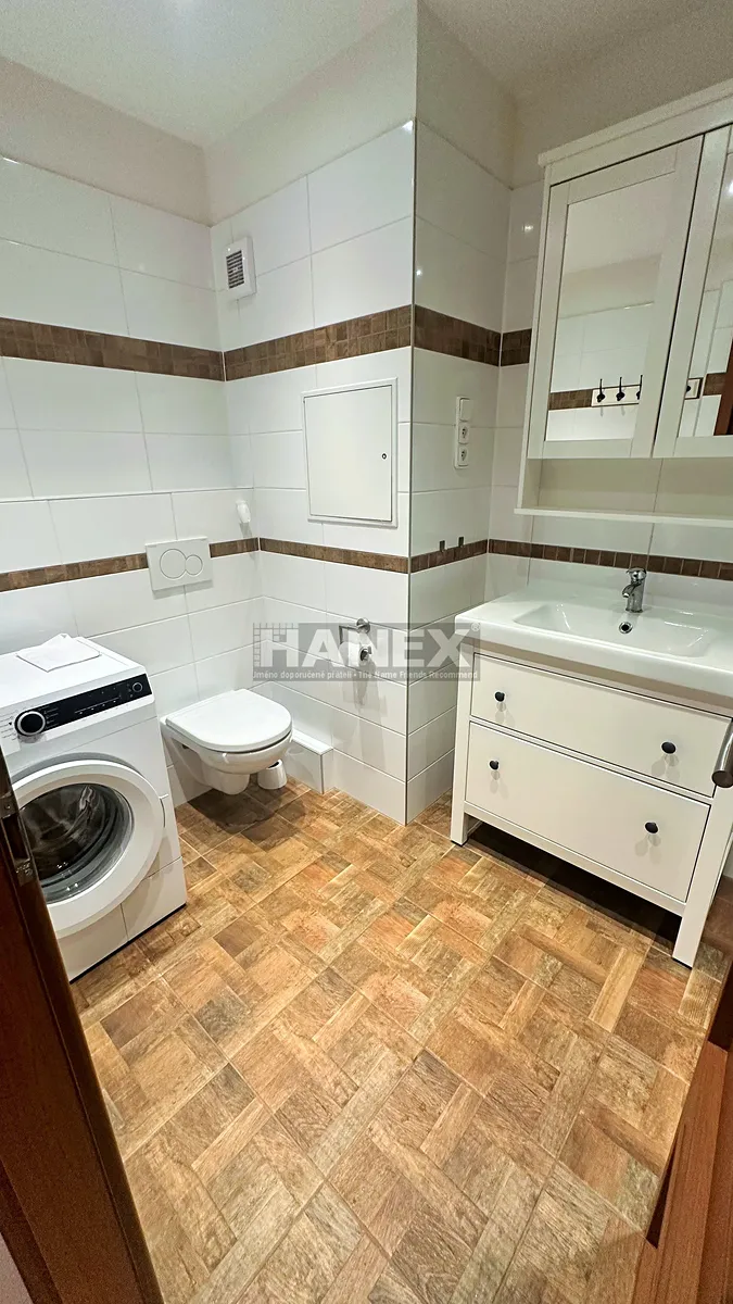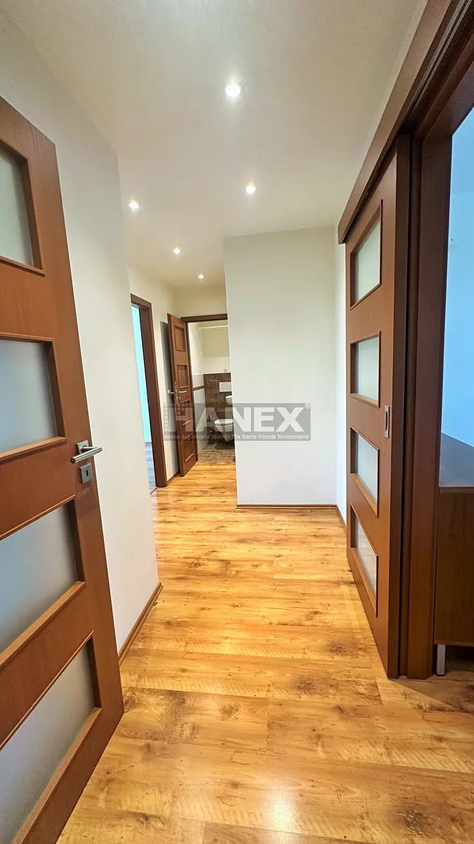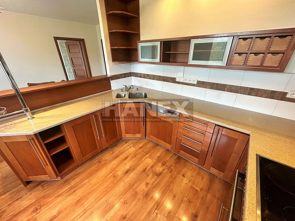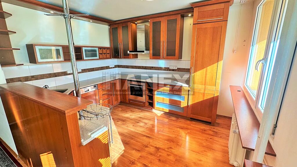 Byt se skládá z prostorné plně vybavené kuchyně, obývacího pokoje, který je opticky oddělen barovým pultem. Dále je zde hlavní ložnice se vstupem na lodžii. Z prostorné chodby, kde je místo pro vestavěné šatní skříně, se vchází do dvou menších pokojů či ložnic. V bytě je samostatná toaleta a koupelna s vanou, toaletou a pračkou. Veškeré vybavení dle fotografiích zůstává. Sklep k bytu není.