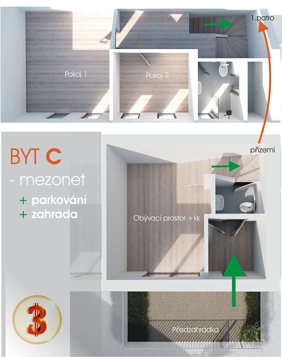 V unikátním projektu MISTŘÍNSKÝ DVŮR Vám nabízíme k prodeji moderní mezonetový byt 3+kk (byt C) v osobním vlastnictví, který kombinuje přízemí i patro cihlové budovy ve výstavbě, a to na hlavní třídě v lokalitě Svatobořic-Mistřína u Kyjova se snadno dostupnou veškerou vybaveností. Tato jednotka je tak ideálním řešením pro rodiny nebo páry, kteří hledají komfortní a moderní bydlení, přičemž je dále jedinečná svým umístěním uprostřed dvora, kde nabízí nejen klid a bezpečí ale také svým mezonetovým řešením simuluje spíše dispozici vlastního řadového domu.
