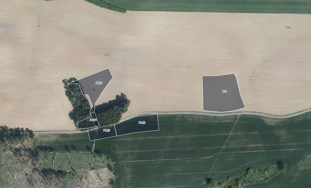 Pozemky jsou evidovány na LV 338 a nacházejí se ve 100% vlastnictví. Celková výměra prodávaného souboru činí 32 824 m², přičemž veškerá plocha je tvořena ornou půdou.