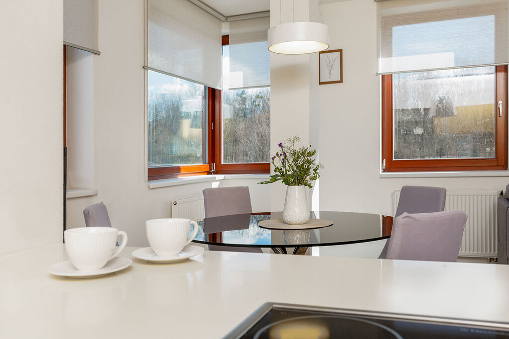 Hned při vstupu do bytu se nachází chodba s vestavěnou skříní, která nabízí dostatek úložného prostoru. Koupelna je vybavená sprchovým koutem, toaletou, umyvadlem s uloženým prostorem a pračkou. Ložnice je disponuje manželskou postelí, komodou, nočními stolky a má přímý vstup na terasu. Hlavní obytný prostor je otevřený a propojuje kuchyňský kout, jídelnu a obývací pokoj. Kuchyňská linka je moderně vybavena troubou, indukční varnou deskou, designovou digestoří, mikrovlnnou troubou a myčkou. V obývací části najdete pohodlnou sedací soupravu, TV stolek, konferenční stolek, komody a jídelní stůl se židlemi. Z této místnosti je rovněž přístup na prostornou terasu s venkovním posezením, která je průchozí i do ložnice.