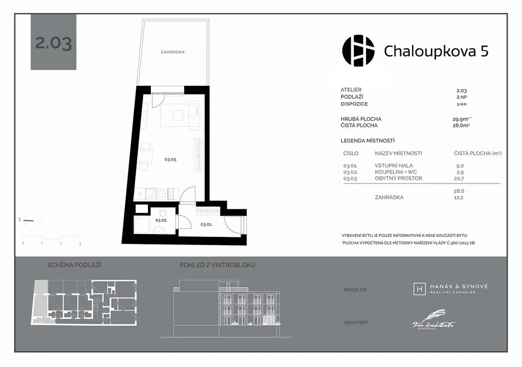 K dlouhodobému pronájmu Vám nabízíme krásný, světlý, moderní atelier 1+kk s velkou terasou v bytovém domě na ulici Chaloupkova, Brno s výbornou dopravní dostupností. Byt o ploše 30 m2 a terasou o ploše 13 m2 je umístěn ve 2.NP cihlového domu s výtahem a je orientován na východ do klidného vnitrobloku. K domu náleží společná kolárna.