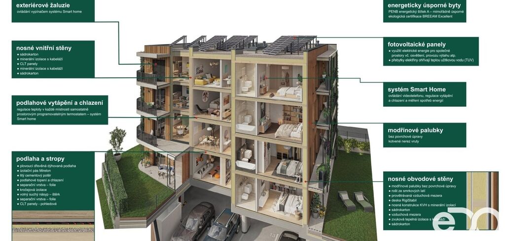 Rezidenční dům TIMBER je první svého druhu v ČR – kombinuje skelet z recyklovaného betonu s masivními CLT panely z certifikovaného dřeva. Stavba vyniká vysokým standardem provedení s důrazem na ekologii, udržitelnost a zdravé bydlení, což potvrzuje i cílená certifikace BREEAM Excellent. V domě je použita rekuperace tepla, systém hospodaření s dešťovou vodou a stavební materiály s nízkou uhlíkovou stopou.