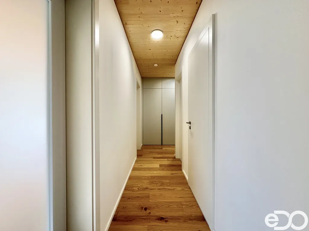 Bytová jednotka o celkové užitné ploše 139 m² se nachází v 1. podlaží budovy a je zcela nová, dosud neobývaná. Užitná plocha bytu, tedy plocha obytných místností uvnitř vnějších stěn nemovitosti, je 57,3 m². Skládá se z chodby s novou vestavěnou skříní na míru, dvou ložnic vč. jedné další vestavěné skříně, obývacího pokoje s novou kuchyní na míru, koupelny se sprchovým koutem a samostatného WC. Ze všech pokojů je možný vstup na krytou terasu s předzahrádkou (76,1 m²). Byt je orientovaný na severozápad. Kuchyně je vybavena spotřebiči značky Brandt – indukční varná deska s digestoří, elektrická trouba a lednice s mrazákem. Dále je v kuchyni vzhledem k dispozici bytu instalována i vestavěná pračka zn. Kluge. K bytu náleží velký zděný sklep (5,3 m²) a garážové parkovací stání (s možností využití wallboxu).