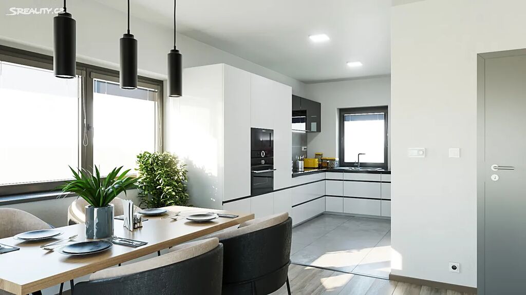 Při vstupu do domu vejdete do chodby. Po pravé straně je technická místnost, hned vedle oddělené toalety. Dále pak vstupujete do prostorného obývacího pokoje o velikost 33,3 m2, ze kterého vede vstup přes velkoformátový HS portál do zahrady. Za obývací částí je prostor pro kuchyni o velikosti 8,2 m2.