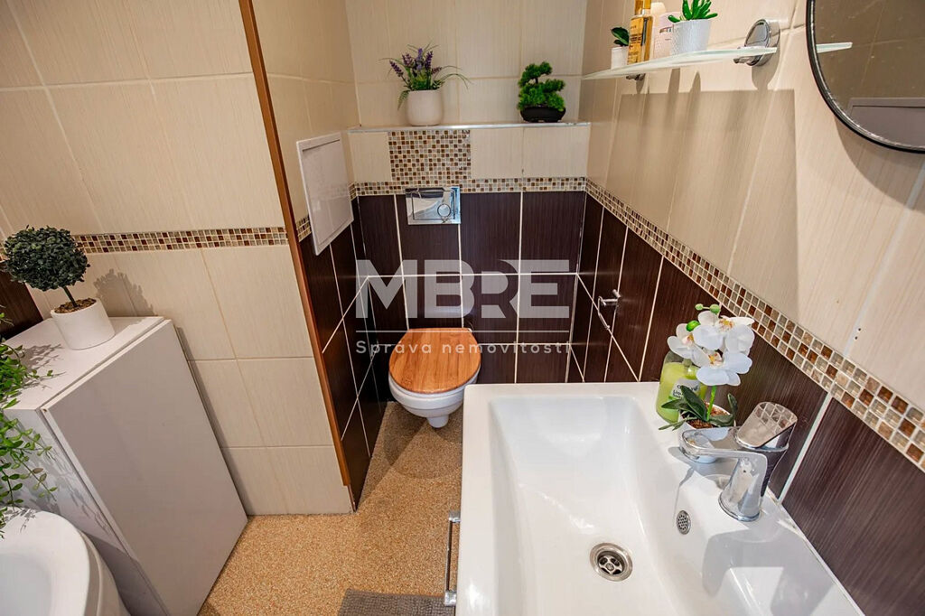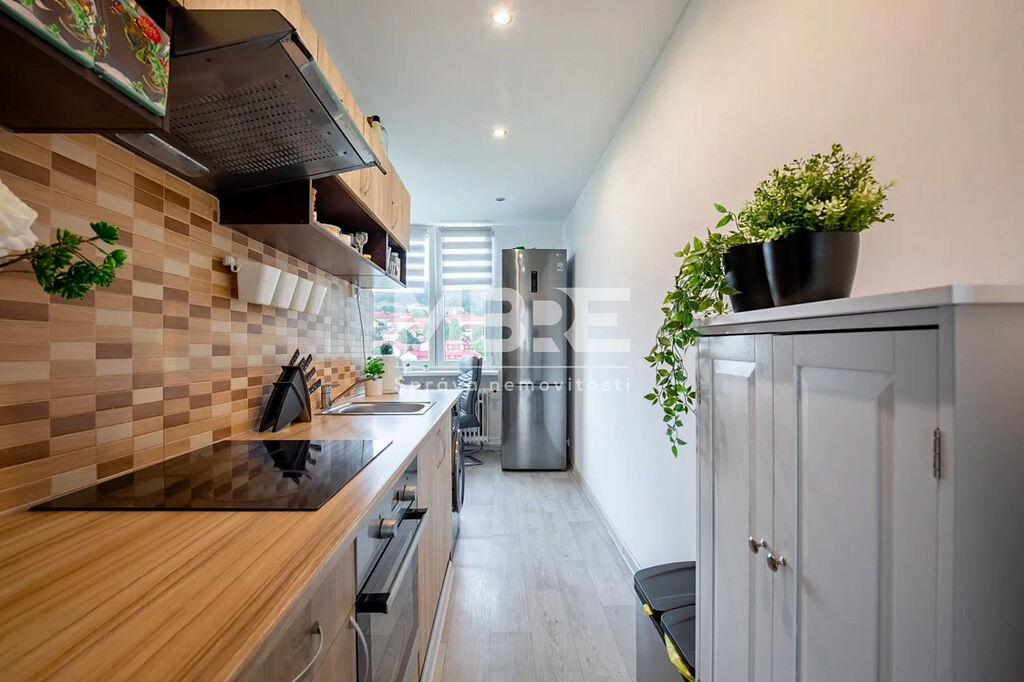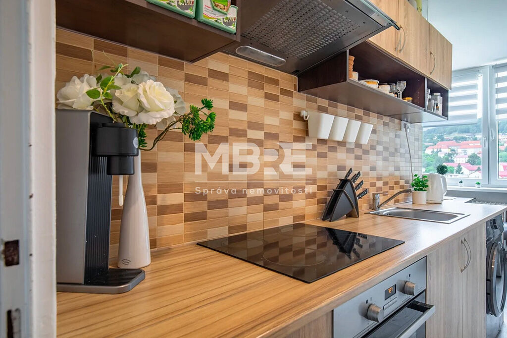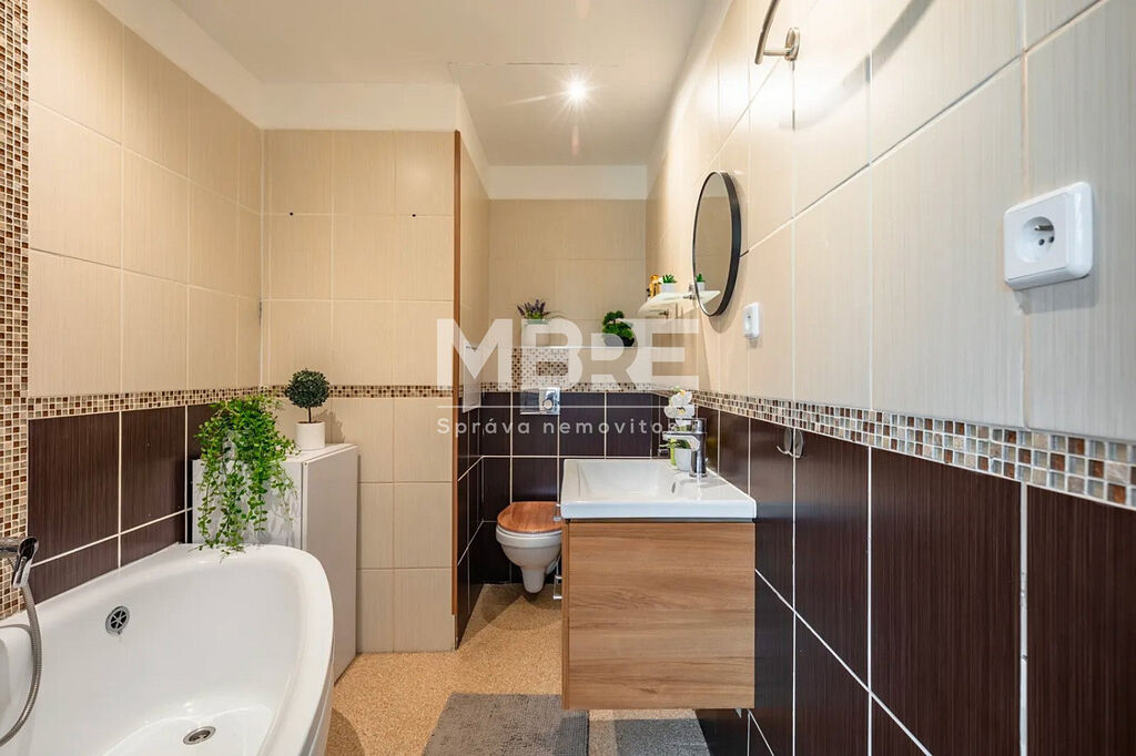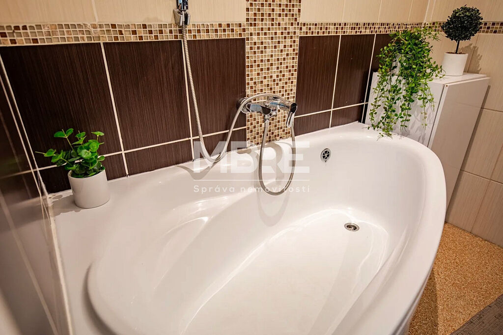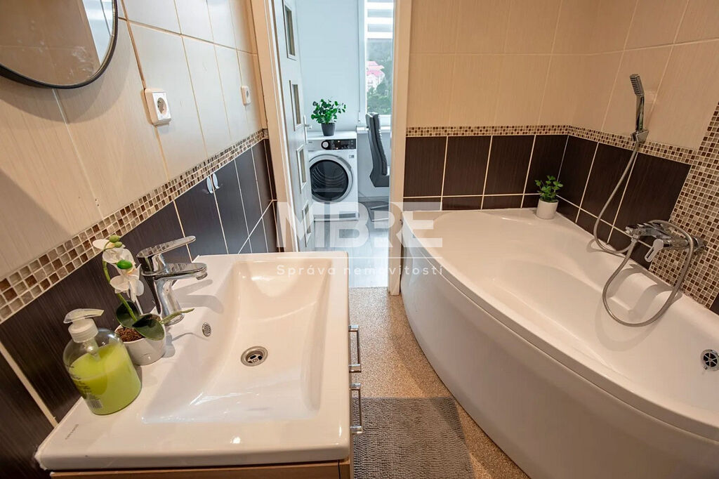 Bytová jednotka disponuje novou kuchyňskou linkou v designu světlé dřeviny se sklokeramickou varnou deskou a místem pro pračku, moderní koupelnou s rohovou vanou, obklady v béžovém tónu a LED osvětlením, prostornými pokoji laděné do světlých tónů a zasklenou lodžií, ideální pro relaxaci s kávou nebo knížkou.