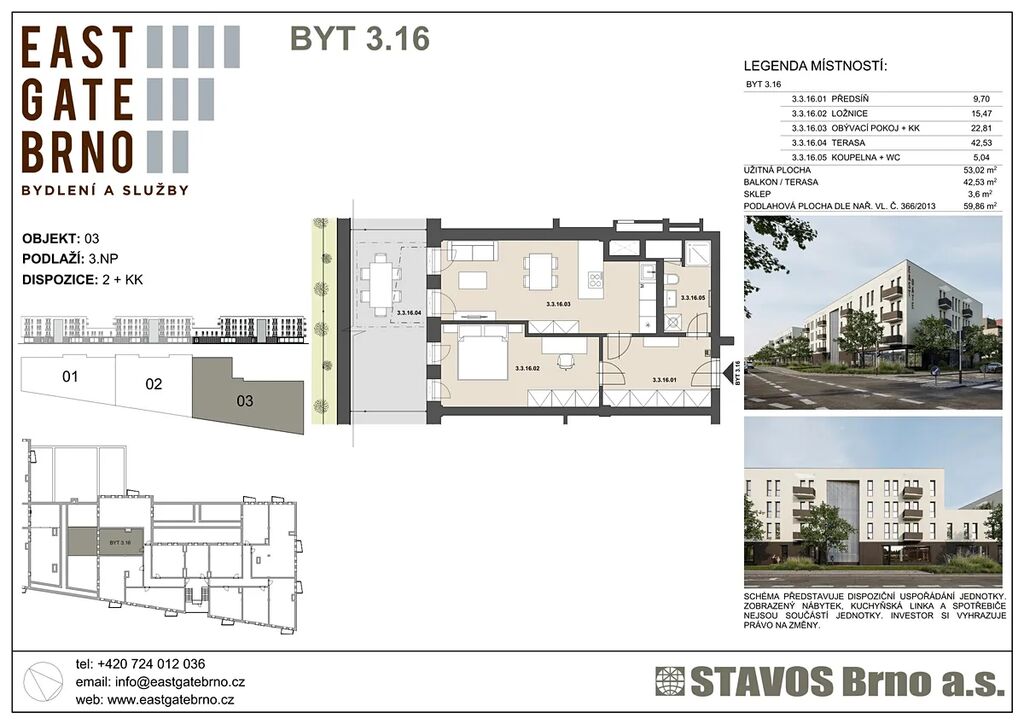 V nově zahájené výstavbě projektu EASTGATE v Brně - Slatině při ulici Řípská nabízíme prodej krásného bytu s terasou. Jedná se byt 2+kk ve III.NP. Dům je vybaven výtahem. Každý pokoj má přístup na terasu (terasa 43 m2). Dispozice je řešena jako obývací pokoj s kuchyní (22,81 m2) a pokoje (15,47 m2), koupelna s WC (5,04 m2) a chodba (9,7 m2) s možností umístění vestavných skříní. Aktuálně se provádí základání stavby a tak je možné přizpůsobit si byt vlastním požadavkům v rámci klientských změn.