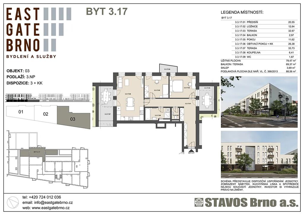 V nově zahájené výstavbě projektu EASTGATE v Brně - Slatině při ulici Řípská nabízíme prodej jedinečnéh bytu s 2 terasami balkonem. Jedná se byt 3+kk ve III.NP. Dům je vybaven výtahem. Byt je prostorný a každý pokoj má přístup na balkon nebo terasu(balkon 2,97 m2, terasa1 32 m2 a terasa2 34 m2). Dispozice je řešena jako obývací pokoj s kuchyní (26,38 m2) a dále dva samostatné pokoje (12,64 + 11,62 m2), koupelna (6,41 m2), samostatné WC (1,87m2) a velmi prostorná chodba (20,55 m2) s možností umístění vestavných skříní. Aktuálně se provádí základání stavby a tak je možné přizpůsobit si byt vlastním požadavkům v rámci klientských změn.