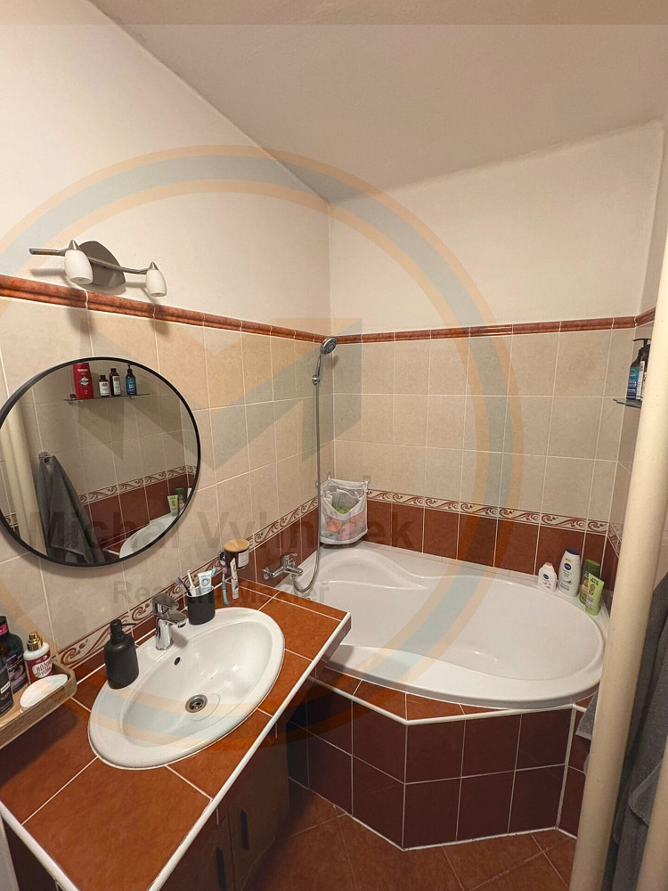 Samostatná koupelna s vanou, elektrickým bojlerem, umyvadlem a WC.