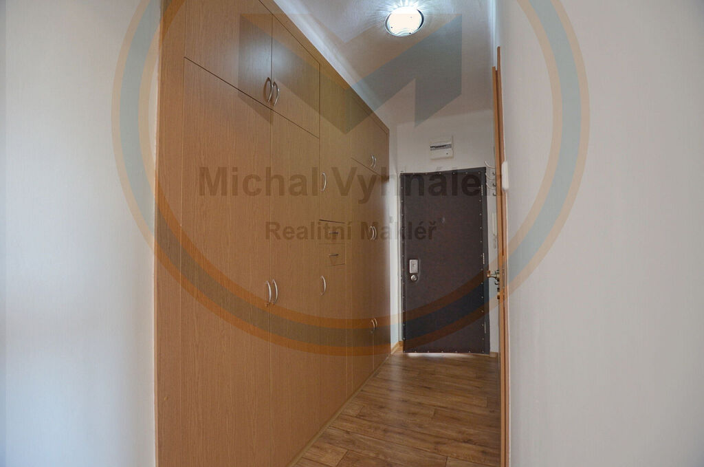 Po vstupu do bytu se ocitnete ve spojovací chodbě, kde je prakticky umístěná vestavěná šatní skříň, která šetří místo.