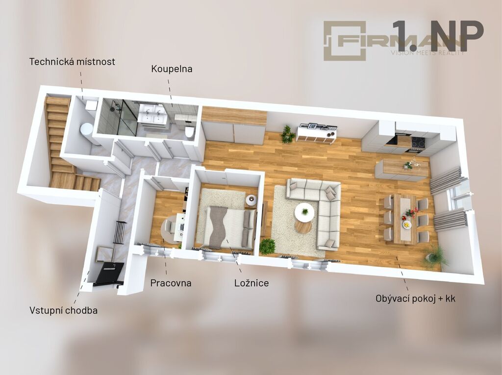 Dispozice nabízí komfortní obývací prostor s novou moderní kuchyní, která plynule navazuje na zbytek bytu a vytváří přirozené centrum dění. Samostatná ložnice je klidnou zónou pro odpočinek a soukromí a pracovna pak přináší praktické zázemí pro home office, kreativní činnost nebo úložný prostor navíc – podle vašich potřeb.