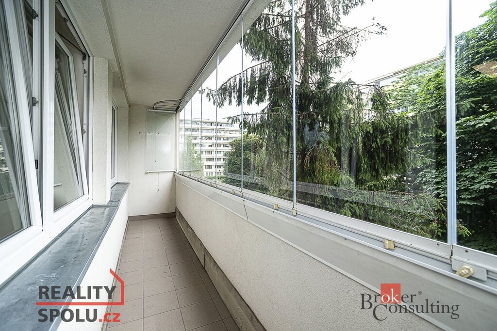 Dominantou bytu je zasklená lodžie s výhledem do zeleně, kterou lze využít jako příjemnou zimní zahradu.