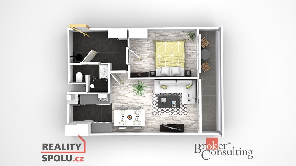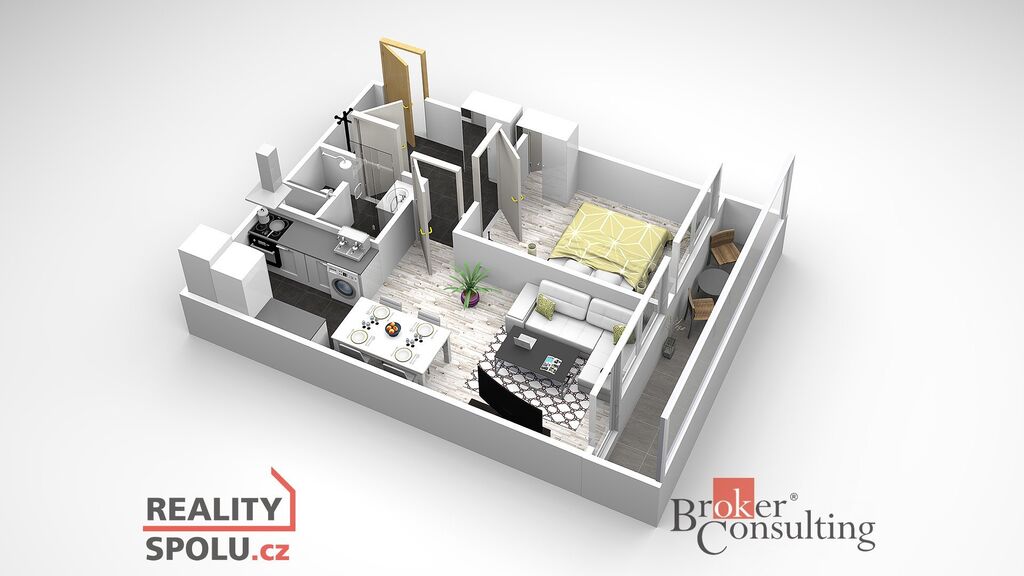 Dispozice bytu je prakticky řešená – vstupní chodba s velkou zrcadlovou skříní plynule navazuje na obývací pokoj s kuchyňským koutem, samostatnou ložnici a moderní koupelnu se sprchovým koutem a toaletou.