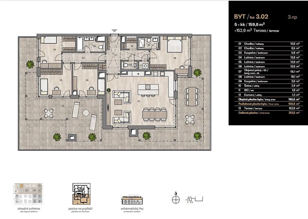 Nabízíme prostorný a světlý byt 5+kk o velikosti 159,6 m² s exkluzivní terasou o velikosti 152,9 m2, který se nachází v moderním bytovém viladomu se soukromým vnitroblokem v atraktivní lokalitě Prahy – Dolních Chabrech. Byt je součástí komorního projektu s důrazem na klid, bezpečí a dostatek soukromí.