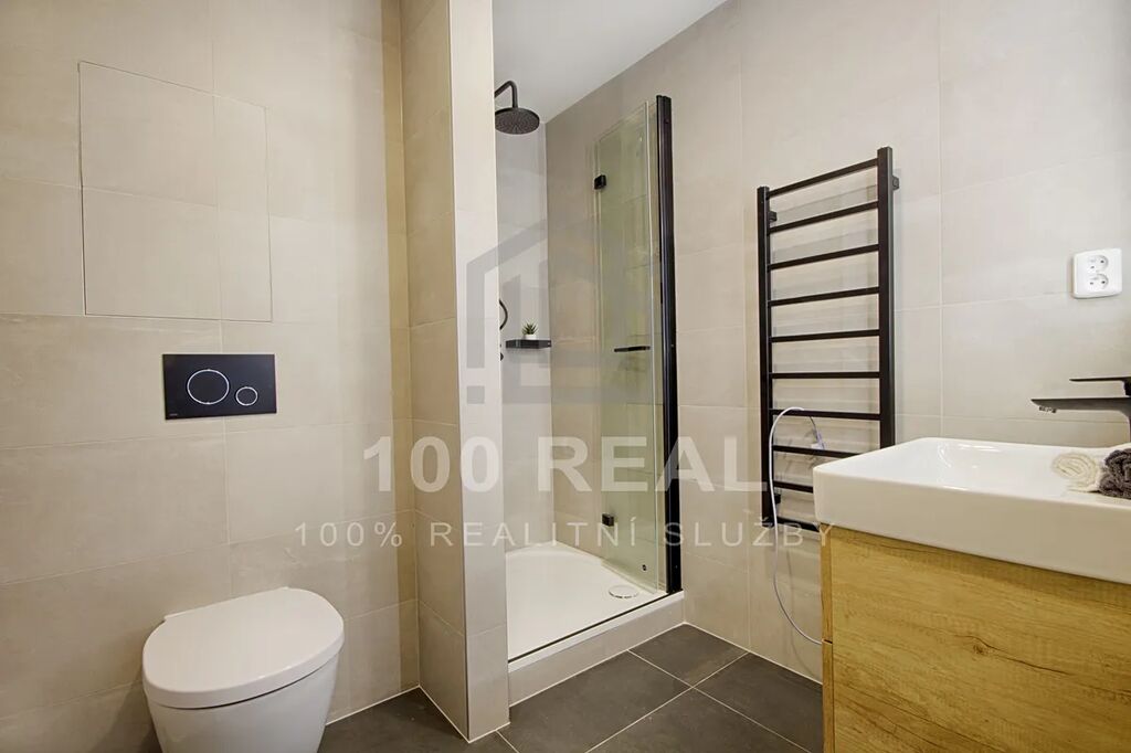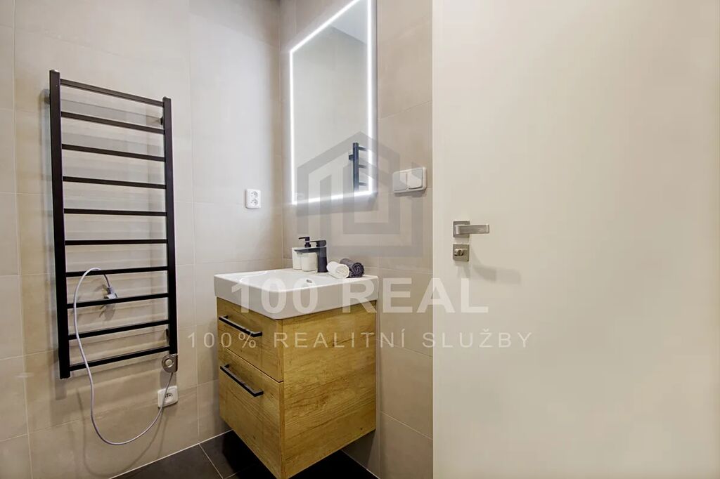 - koupelna se sprchovým koutem, umyvadlem, umyvadlovou skříňkou, topným žebříkem, světelným zrcadlem + WC