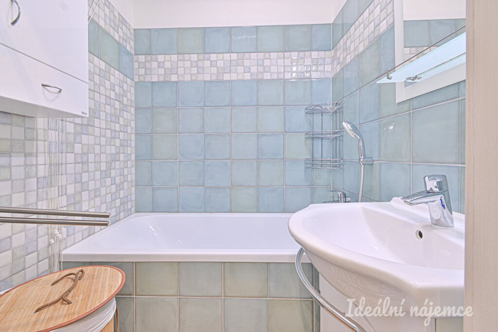 Koupelna disponuje vanou a umyvadlem se skříńkou. Toaleta je oddělena.