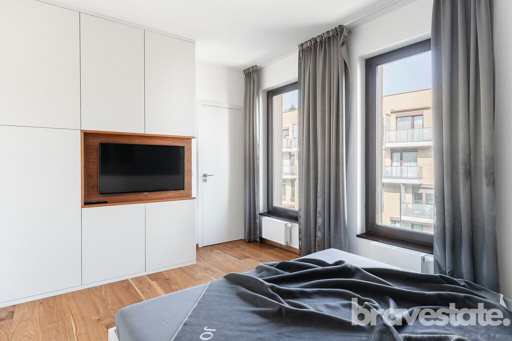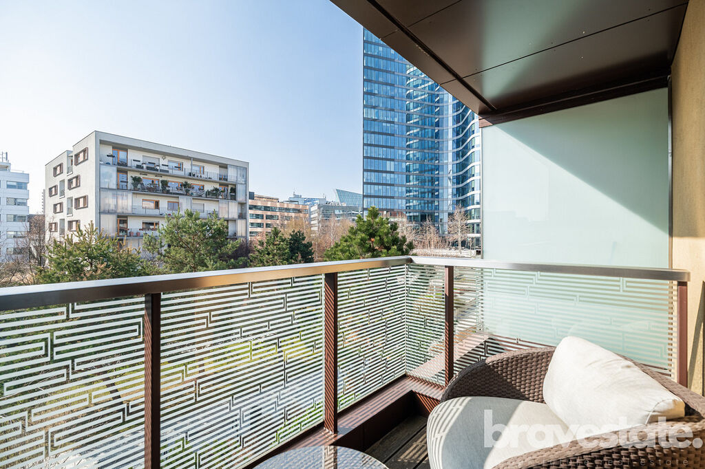 Zabezpečený vstup do bytu vám zajistí bezpečností ocelové dveře s čtyřbodovým zamykáním. U vchodu se nachází prostorná předsíň s vestavěnými úložnými prostory a toaletou. Na západní stranu bytu lze vejít do první ložnice s klasickou manželskou postelí, vestavěným nábytkem a televizí. K tomu náleží koupelna se sprchovým koutem a umyvadlem. Druhá ložnice řazena jako hlavní se nachází severozápadním křídle bytu. Nabízí průchozí šatnu, prostornou koupelnu se sprchovým koutem, dvěma umyvadly a toaletou. Obývací pokoj se nachází ve východní části bytu. Nabízí plně výbavou kuchyň spotřebiči Miele, obývací pokoj s designovou sedací soupravou, křeslem, televizí a konferenčním stolem. Z obývacího pokoje je přímý vstup na balkón o velikosti 3,5 m², kde se nachází lounge posezení a je zde nádherný výhled na přilehlý park. Součásti vybavení je taktéž středně velký trezor s certifikovaným zabezpečením a ochranné zvenku neprůhledné fólie na oknech.