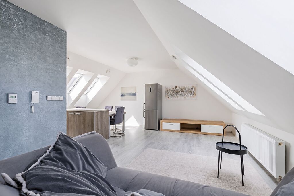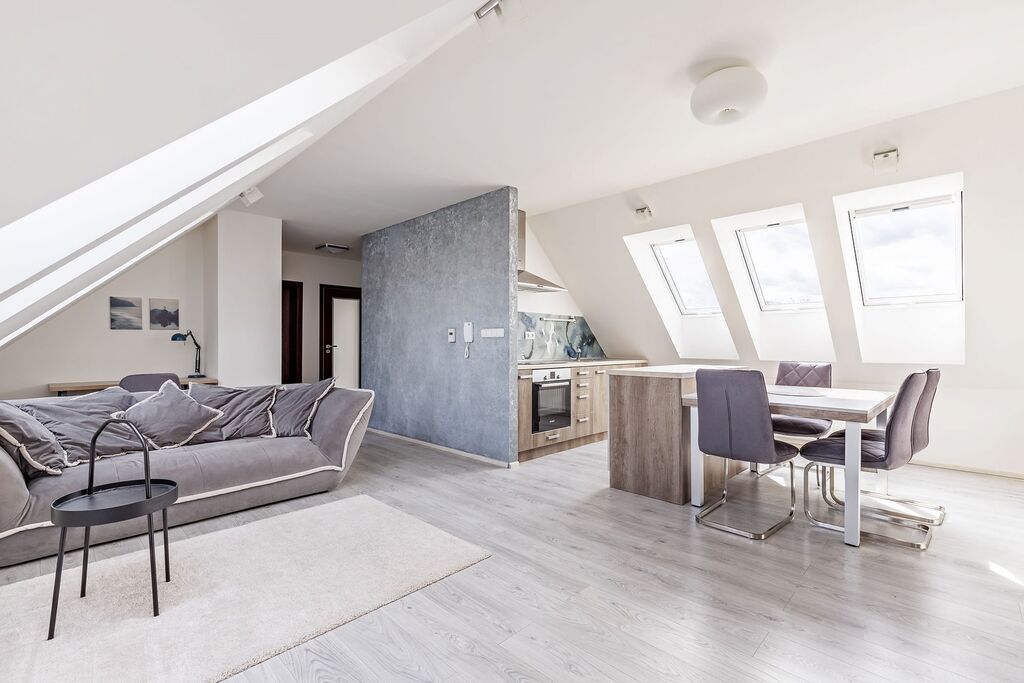 Hlavní obytný prostor je tvořen prostorným obývacím pokojem s kuchyní, který je vizuálně oddělen od jídelní části, vybavení tvoří vestavěné spotřebiče - trouba, indukční varná deska, lednice. Pracovní kout je chytře schován v rohu místnosti. Další místnost tvoří ložnice s orientací do zahrady - vnitrobloku.
