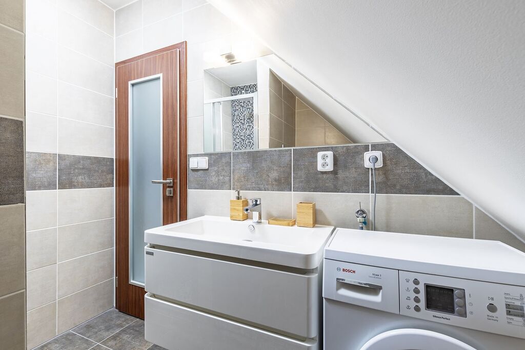 Celý byt je v podkroví vstupní halou chytře oddělen od zbývajících 3 bytů, takže poskytuje dostatek soukromí. Výhodou je vlastní parkování před domem a zároveň klidné místo v cihlovém domě a také bezprostřední dostupnost služeb a MHD 1min. chůze. Úřad a pošta taktéž.