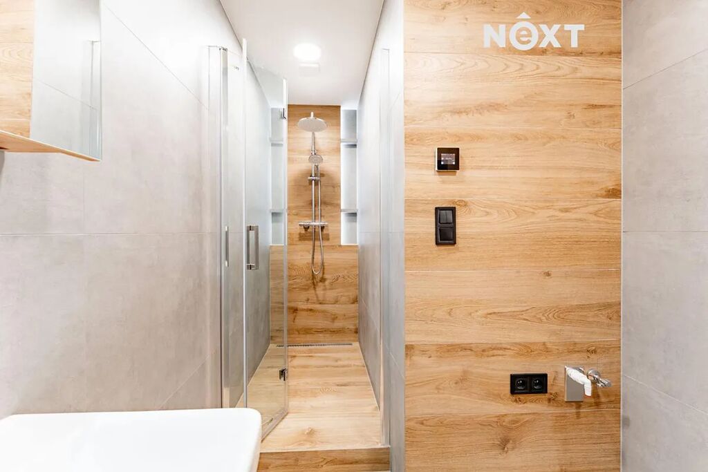 Dispozice bytu je praktická a vzdušná – z chodby se vchází do koupelny se sprchovým koutem, samostatné toalety a jednoho z pokojů. Dále je zde obývací pokoj s lodžií, kuchyně s vestavěnými spotřebiči a další pokoj. Všechny místnosti jsou orientovány na východ, takže je byt po celý den příjemně prosvětlený.