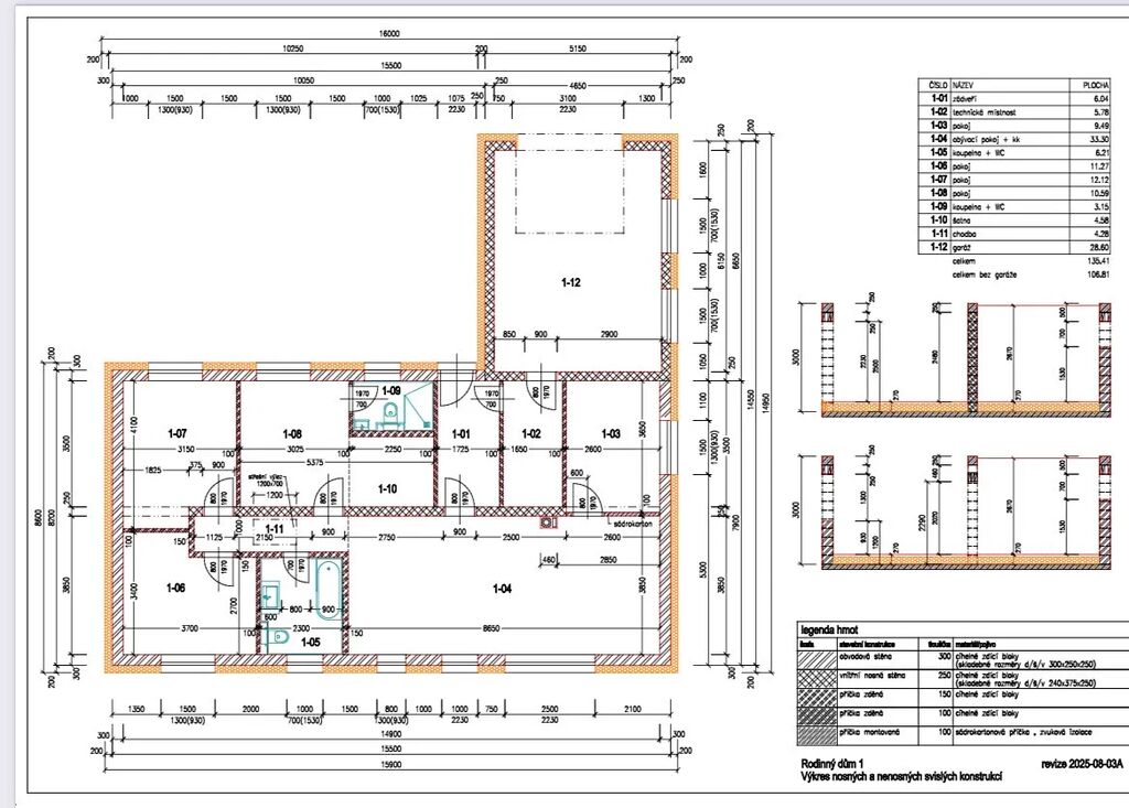• Dvě koupelny, šatna v hlavní ložnici, výklenky pro vestavěné skříně