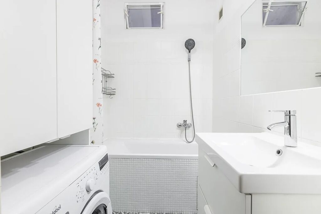 V koupelně k dispozici pračka, úložné prostory v chodbě i jednotlivých místnostech. Stačí se jen nastěhovat.