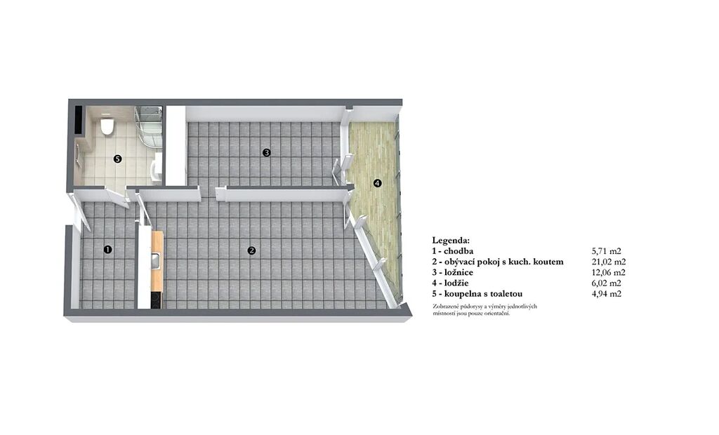Byt o celkové podlahové ploše 52 m2 se skládá z předsíně s prostornou šatní skříní, koupelny se sprchovým koutem, ložnicí, kuchyní s kuchyňskou linkou vybavenou myčkou, troubou, sklokeramickou deskou a digestoří, která volně navazuje na obývací pokoj. V ložnici a obývacím pokoji jsou velká francouzská okna s izolačními trojskly, která výrazně prosvětlují celý byt. Z obou místností se vchází do zajímavě řešené lodžie. V celém bytě je podlahové vytápění s napojením na dálkový zdroj tepla. Součástí bytu je také parkovací stání a sklep o rozloze cca 3,7 m2. Dále je možné využívat společné prostory domu.