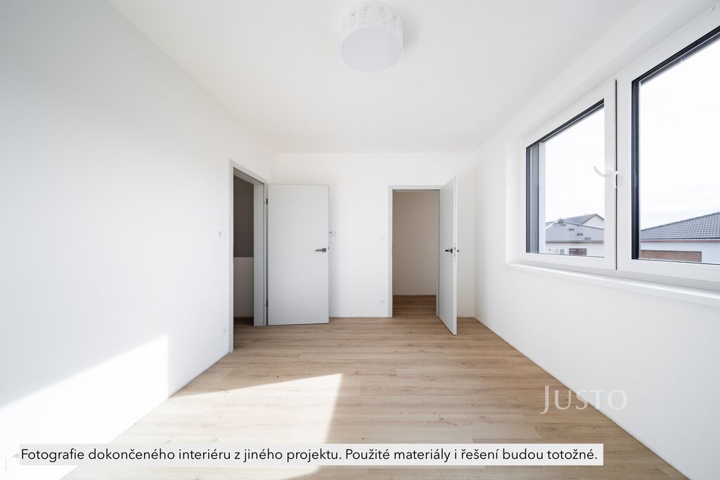 Dispozice domu je promyšlená do posledního detailu. Dominantou přízemí je otevřený obývací prostor s kuchyňským koutem o výměře 34,84 m² – místo, kde se odehrává každodenní rodinný život. Díky přímému vstupu na terasu (13,8 m²) a zahradu se interiér krásně propojuje s venkovním prostorem. Nechybí ani pracovna či pokoj pro hosty (9,69 m²), který se přizpůsobí vašim aktuálním potřebám – ať už jde o práci z domova, nebo ubytování návštěvy. Dále v přízemí najdete zádveří (5,43 m²), chodbu (5,14 m²), technickou místnost (2,10 m²) a koupelnu s walk-in sprchovým koutem a WC (4,69 m²).