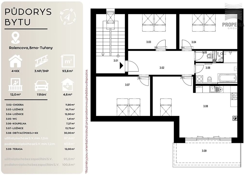 Nabízená bytová jednotka o dispozici 4+KK (UP 87,8 m²) je navržena s důrazem na moderní životní styl, maximální pohodlí, dostatek denního světla a efektivní využití prostoru. Umístěna je ve 3. nadzemním podlaží, kde zaujímá celé patro, takže poskytuje naprosté soukromí bez sousedů. Díky jihovýchodní orientaci a velkému portálovému oknu je hlavní obytná část s kuchyňským koutem krásně prosvětlená. Navazující terasa (12 m²) je ideální pro téměř celoroční využití. Naopak severozápadně orientované ložnice nabídnou perfektní zázemí pro klidný spánek. Střed bytu tvoří koupelna s vanou i sprchovým koutem a samostatné wc.