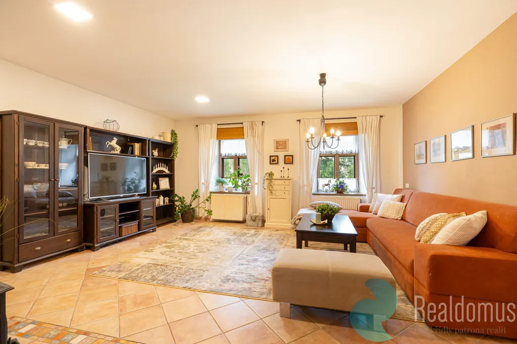 Rezidenční část usedlosti o ploše 197 m² poskytuje vysoký komfort pro rodinné bydlení, dlouhodobý či krátkodobý pronájem. Dispozice je řešena do dvou podlaží – v přízemí se nachází velkorysý obývací prostor s krbovými kamny, kuchyně s jídelnou a přímým vstupem na terasu, v patře pak galerie s pracovnou, dvě prostorné ložnice a koupelna. Každý detail domu ukazuje vysoký standard provedení i kvalitu materiálů.
