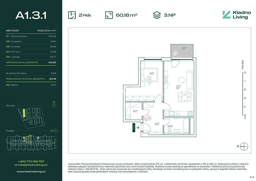 Nabízíme ke koupi moderní byt 2+kk o podlahové ploše 60,2 m² s balkonem 3,8 m² v rezidenčním projektu Kladno Living, který vzniká v jedné z nejatraktivnějších lokalit města Kladno – Kročehlavy. Tento nový developerský projekt představuje jedinečnou příležitost pro ty, kteří hledají nové byty v Kladně nebo investici do nemovitosti s vysokým potenciálem zhodnocení.