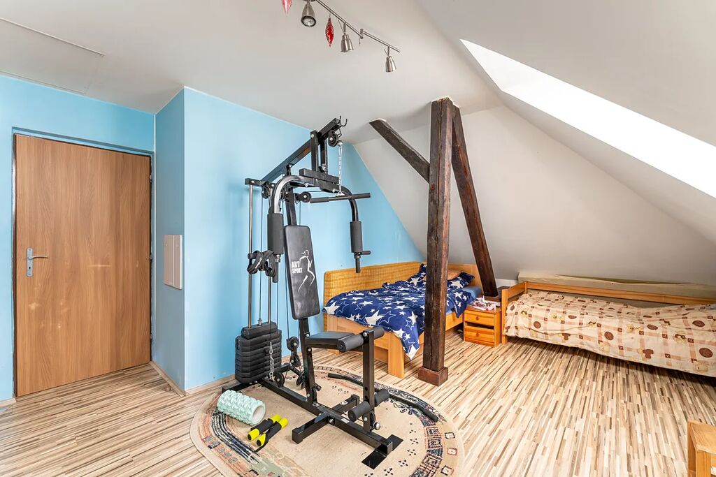 - podkroví o rozloze cca 86 m², které bylo postupně upravováno pro bydlení s dispozicí dvou ložnic, koupelnou s wc a sprchovým koutem, šatnou.