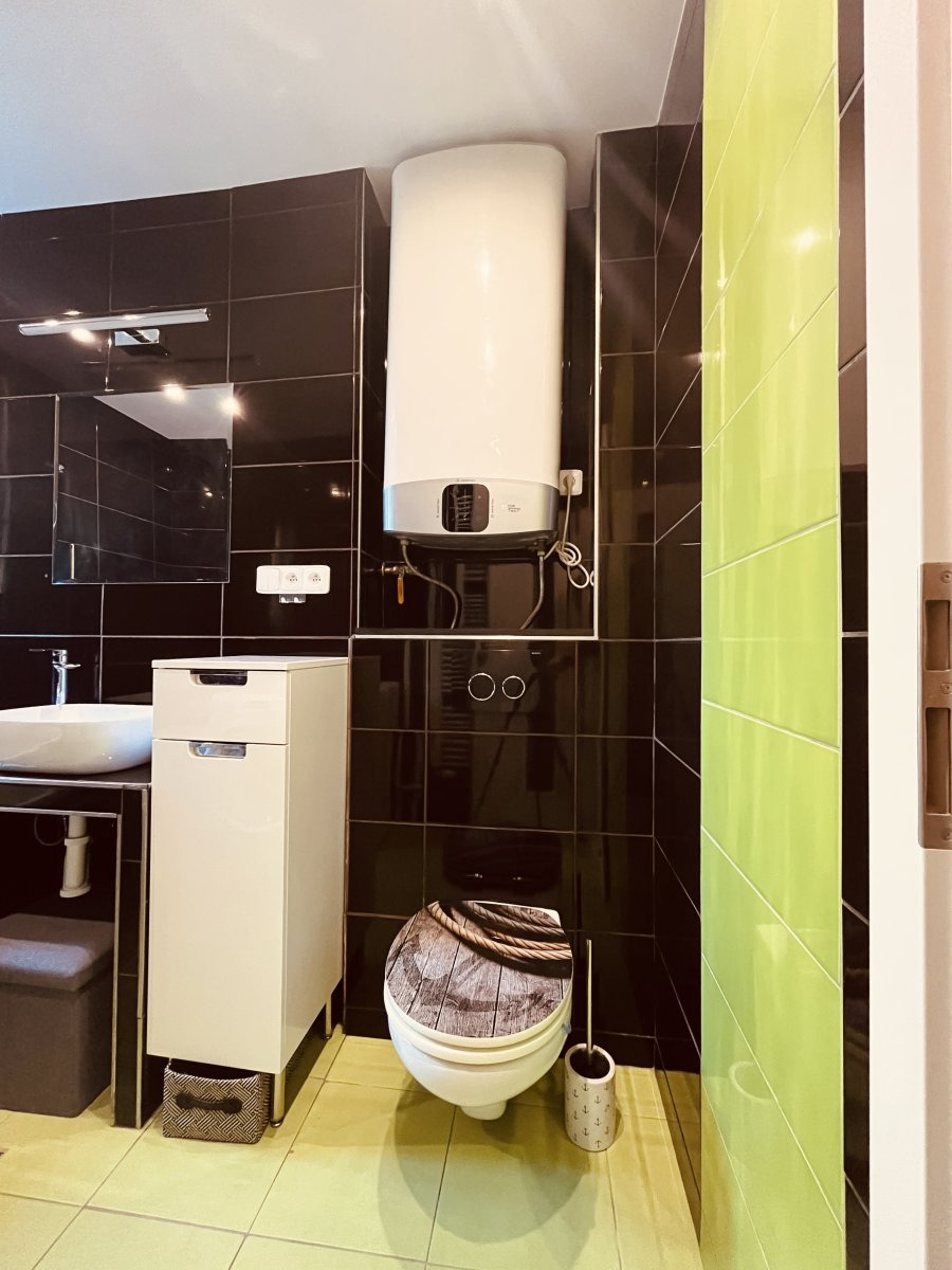 Koupelna s toaletou a sprchovým koutem, k dispozici pračka