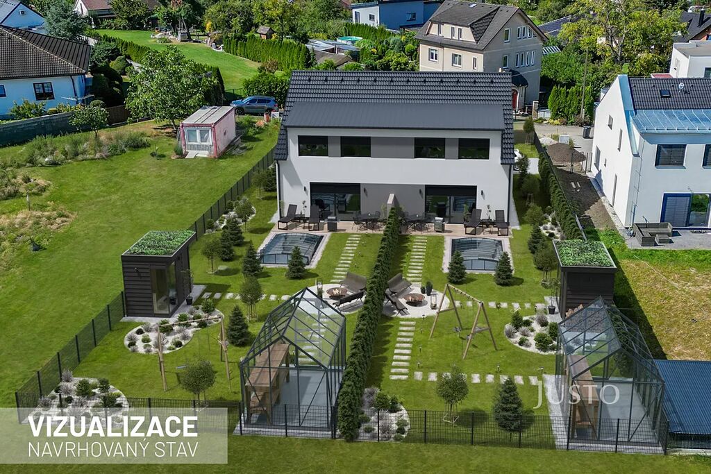 Dispozice 5+kk s užitnou plochou 121 m² nabízí velkorysý prostor, který si zamilujete hned při první prohlídce. Součástí každé jednotky je navíc vlastní zahrada o výměře cca 282 m², dvě parkovací stání, terasa, vlastní tepelné čerpadlo značky Panasonic, nezámrzný venkovní kohout na vodu, příprava na venkovní žaluzie (bez lamel), hotový plot a mnoho dalšího. Zahrada bude předána srovnaná a s navezenou ornicí, připravená k osetí trávníkem. Praktickým benefitem je také dostatečně široký přístup na pozemek kolem jednotky, včetně hotového chodníku.